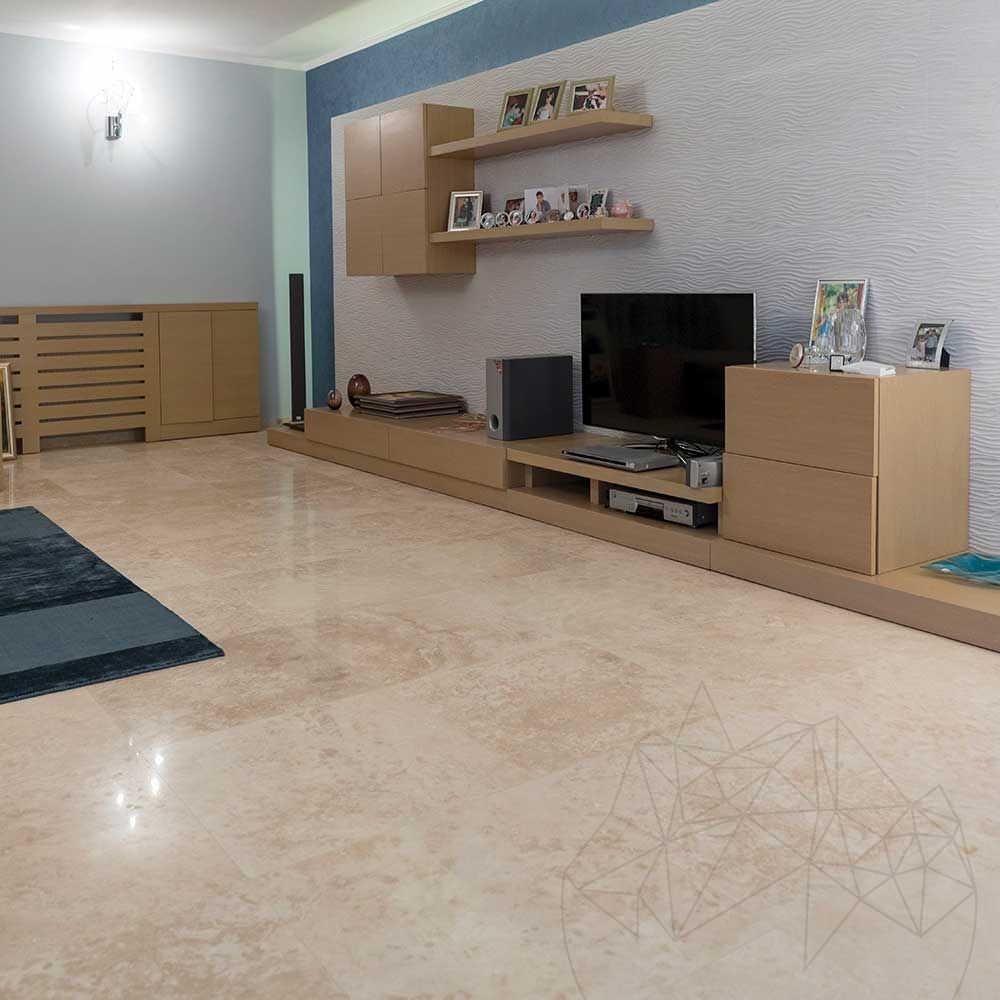 Пример за изключителен дизайнерски лукс е интериор на дневна от травертин, при който стените, пода и камината са облицовани с красивия камък. Пространството изглежда едновременно флуидно – травертинът е обгърнал всичко и нищо не спира погледа на наблюдаващия – и масивно, сякаш целият интериор е издялан от един огромен къс камък. Фината игра между монохромния и естествен цвят и текстура придават на едно такова пространство изключително усещане за стил и разбиране за дизайн, но също така и деликатно доловими приветливост и уют.