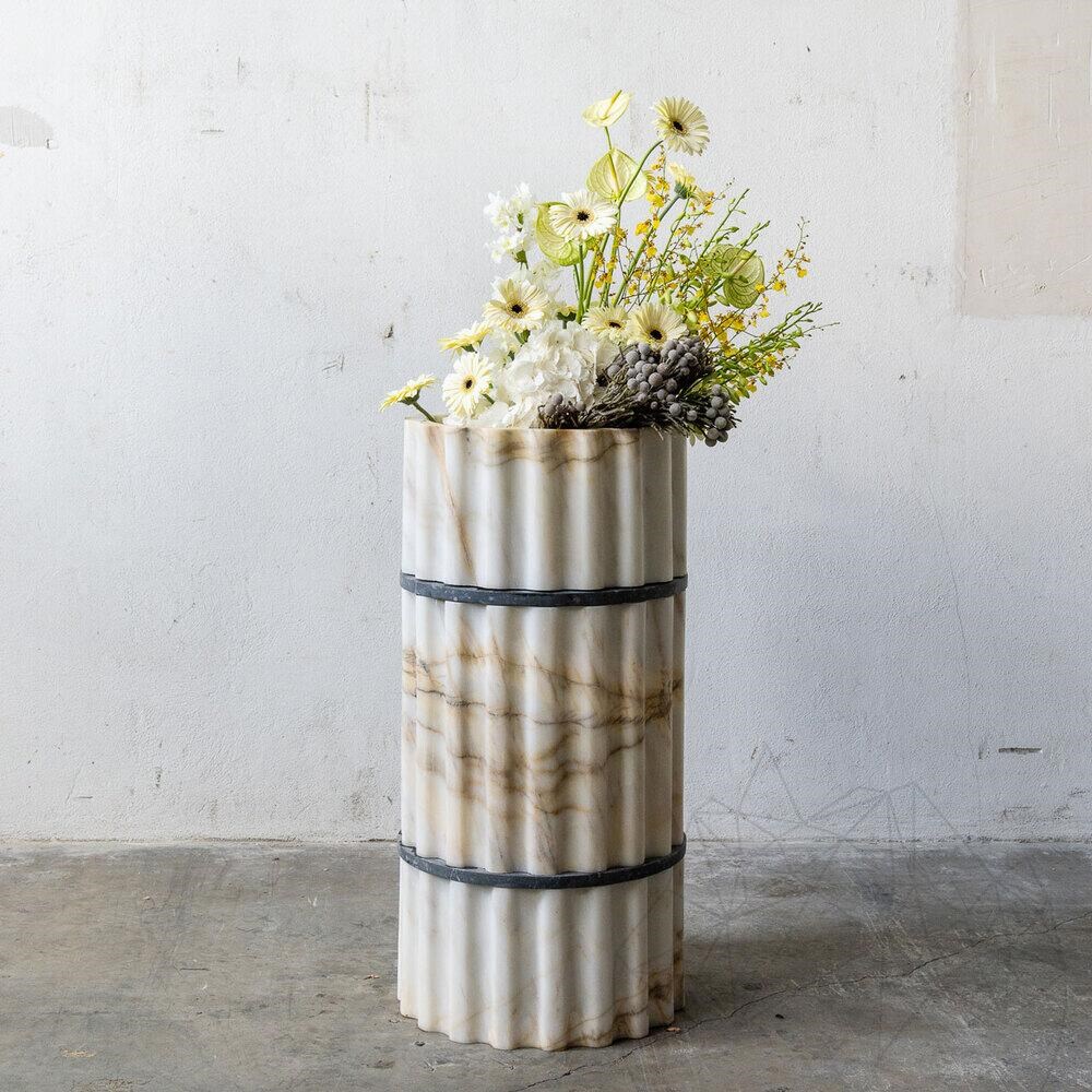 Свободностоящата мивка за баня ТАО е с диаметър 42 cm и височина 82 cm, с цилиндрична форма и странично оттичане. Батерията на мивката може да бъде монтирана на плота, на пода или на стената. За по-лесно боравене и монтаж мраморната мивка за баня е разделена на 3 части, отделени с мраморни пръстени.
