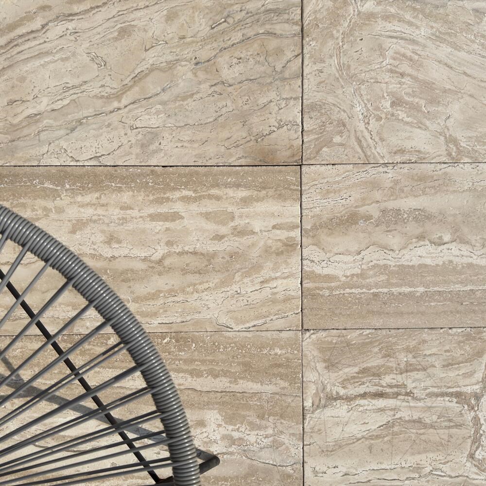С естествен дизайн и опесъчена повърхност, която подчертава непреходната красота на камъка, oпесъченият травертин Стриато Беж във формат 61 x 30.5 x 3 см е идеален избор за външни пространства, съчетаващи изтънченост и устойчивост.
